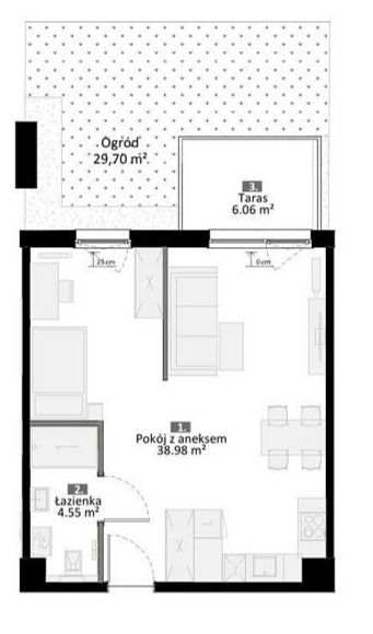 - pokój z aneksem o pow. 38,96 m2 ( możliwość zrobienia 2 pokoi)