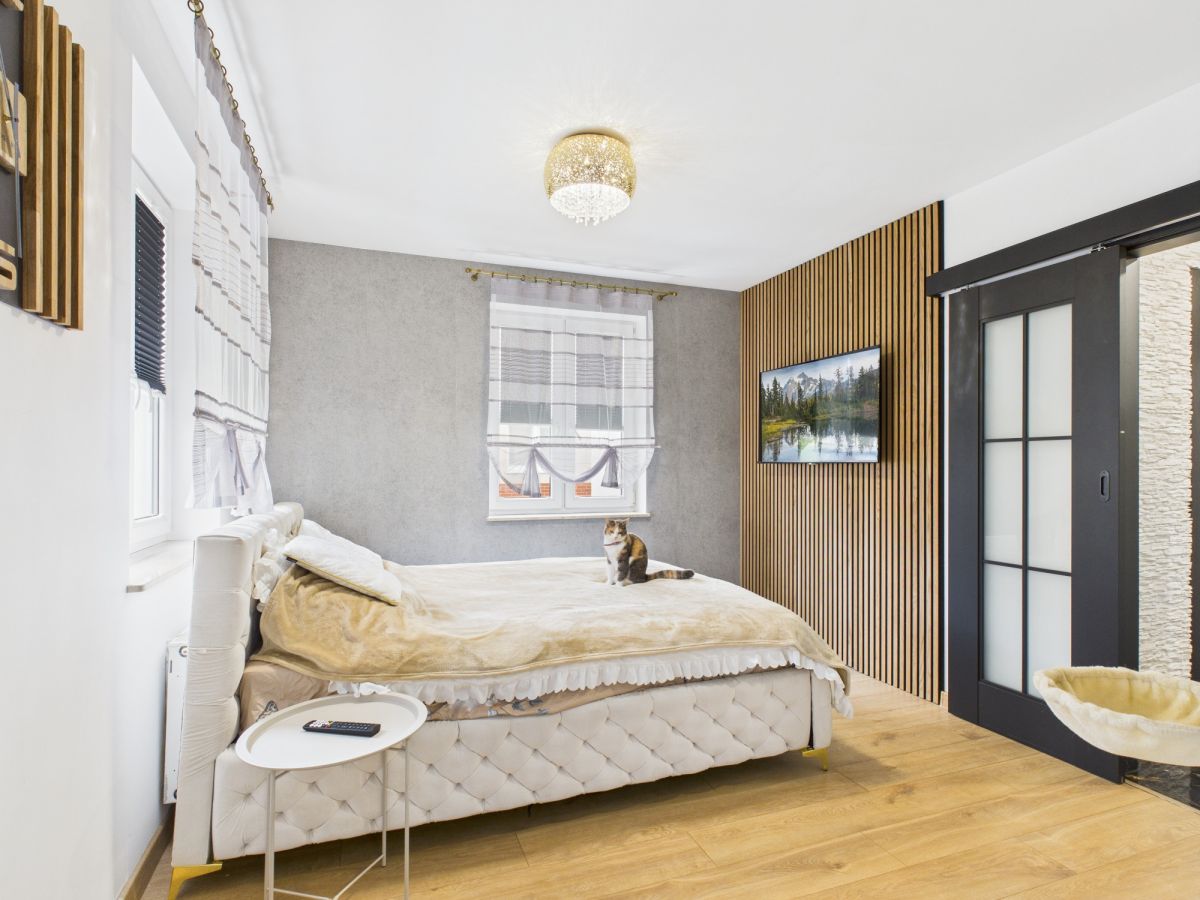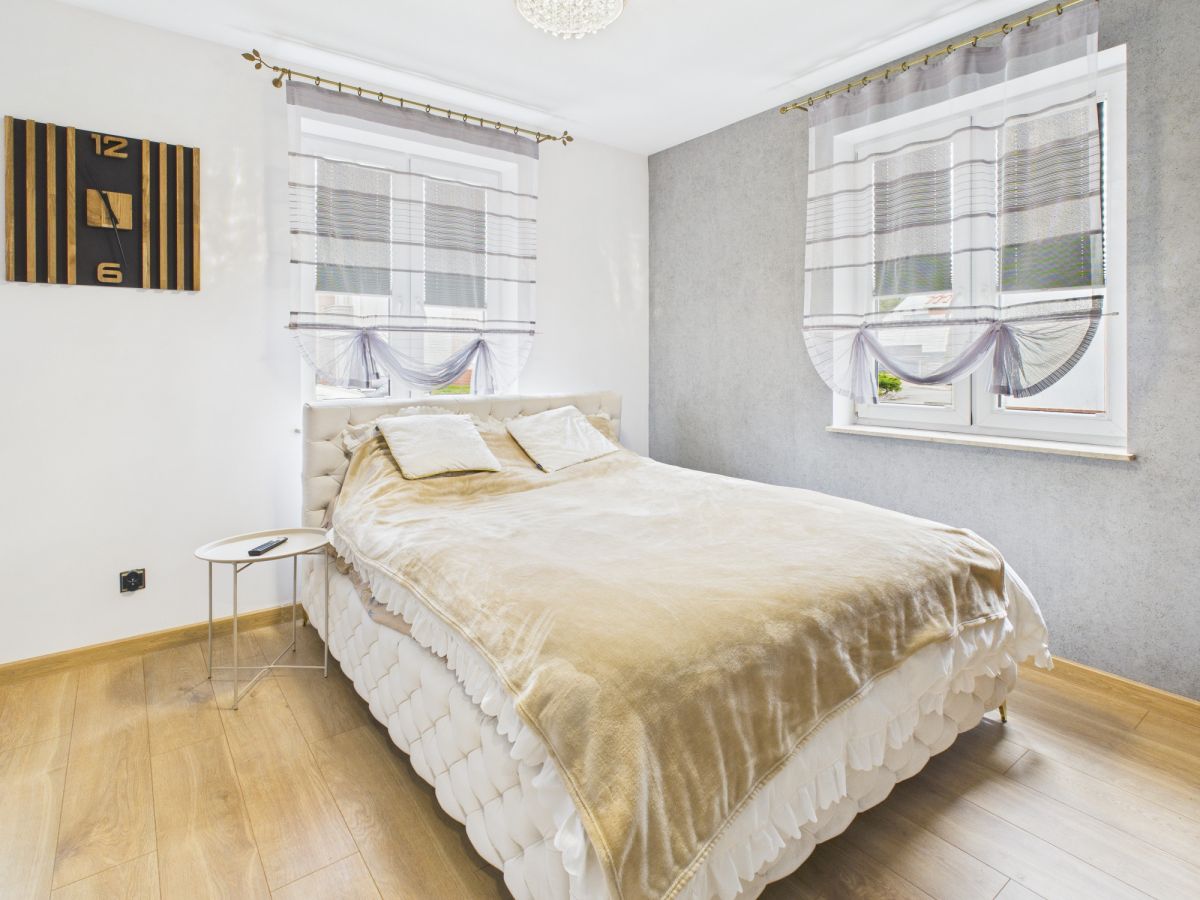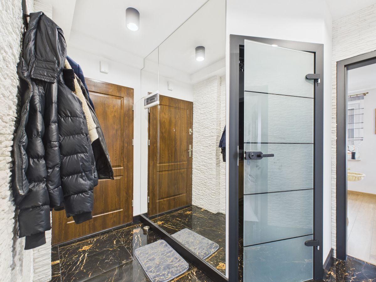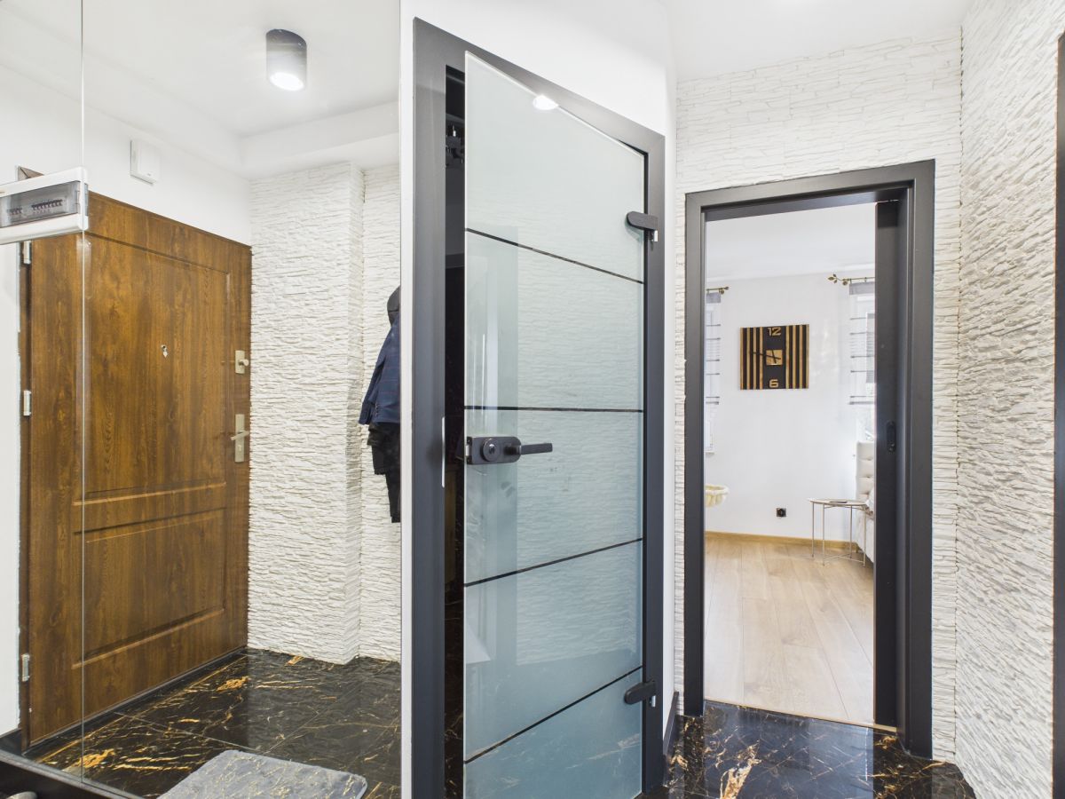 Lokal jest bardzo elegancko i przemyślanie wykończony- podłoga w kuchni i przedpokoju jest podgrzewana, na ścianach w salonie i sypialni znajdują się lamele założone miesiąc temu.