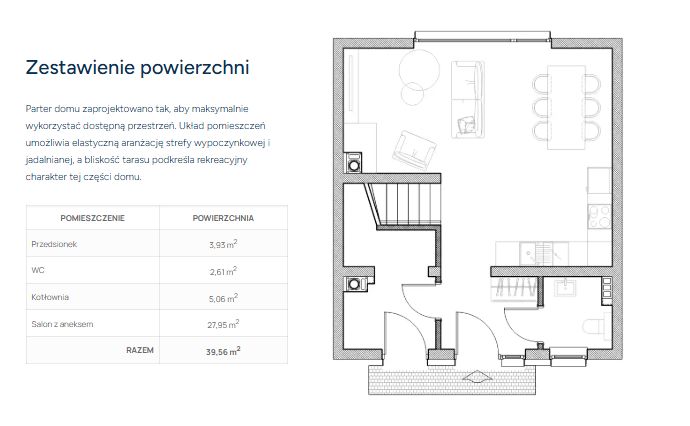 PARTER (Strefa dzienna): Przestronny salon z aneksem (blisko 28 m²!) z bezpośrednim wyjściem na ogród (58 m²). Do tego kotłownia, WC i ustawny korytarz.